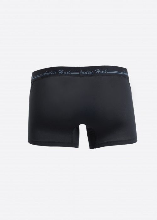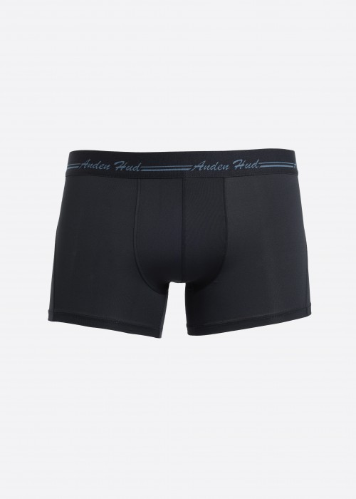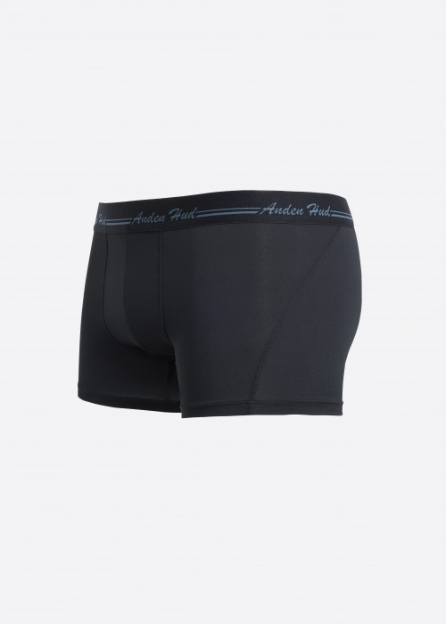 男款_吸濕排汗機能系列.短版變化平口內褲(夜海藍-手寫logo黑緊帶)